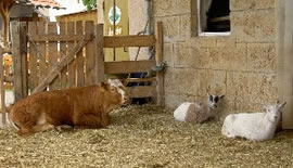 den Paddock mit der kleinen Kuh Elvis und deren beiden Ziegen-Fans.